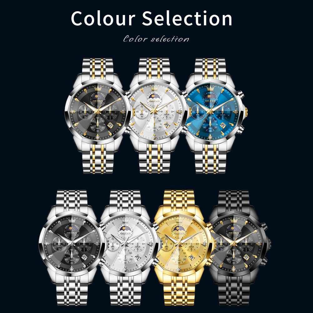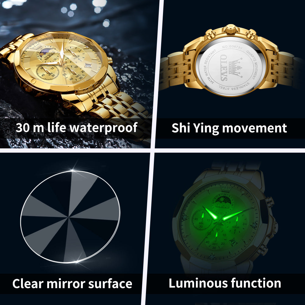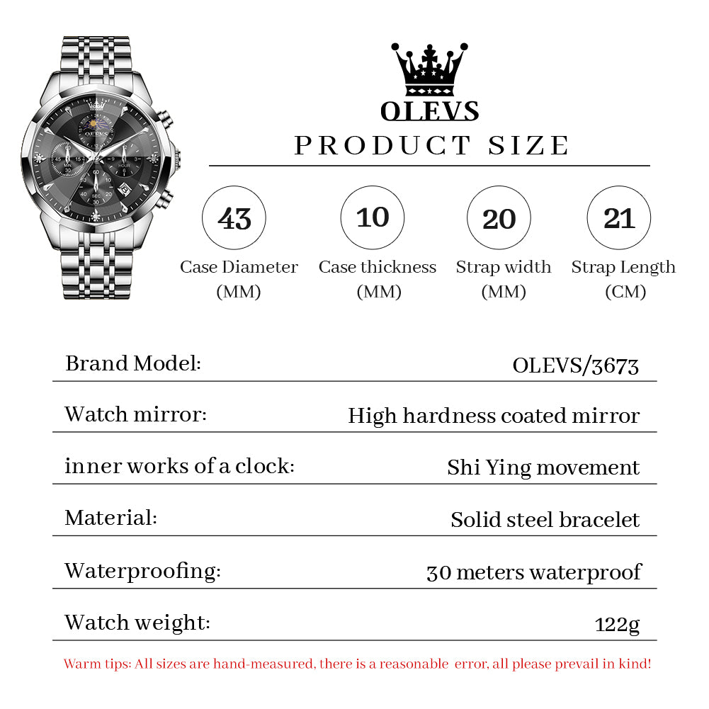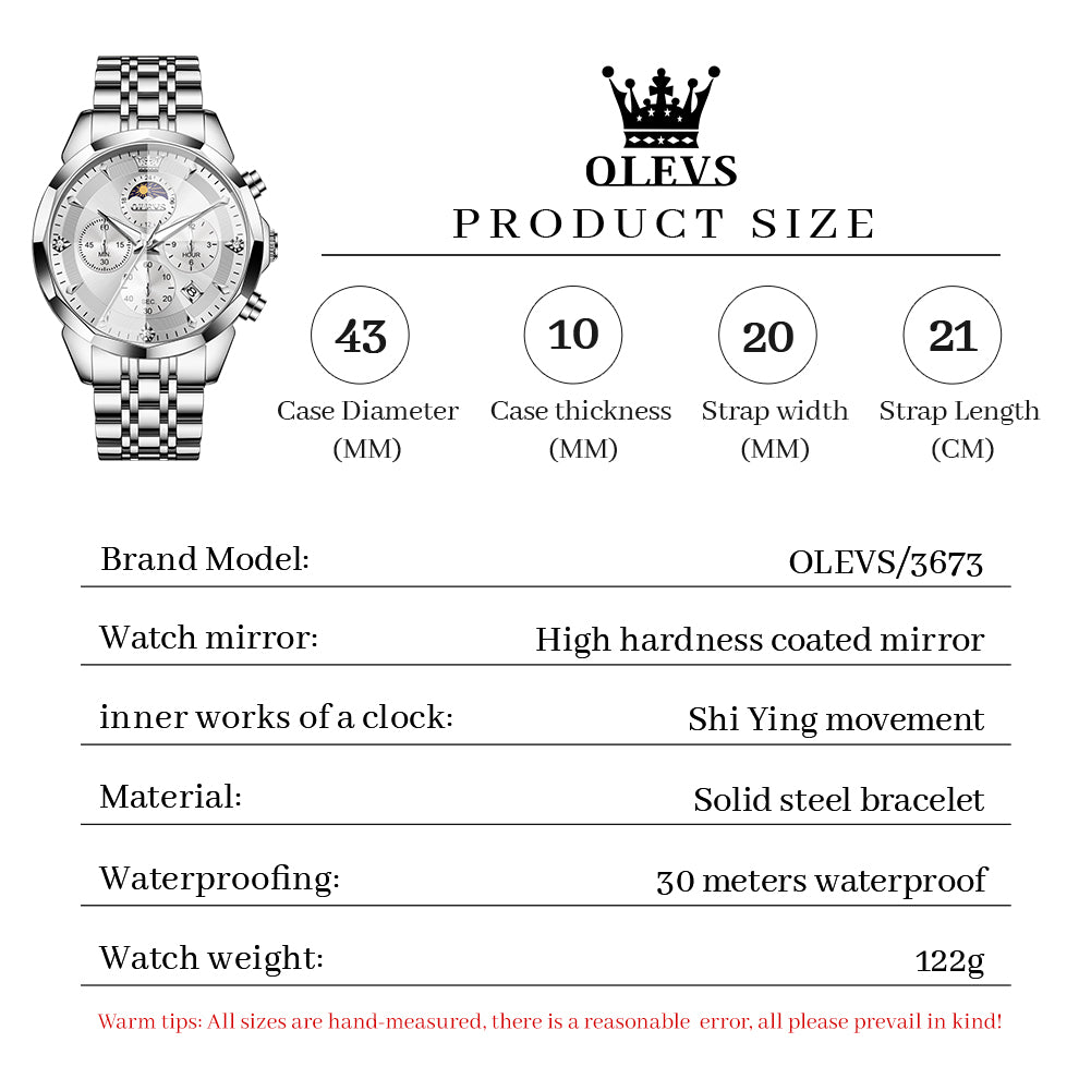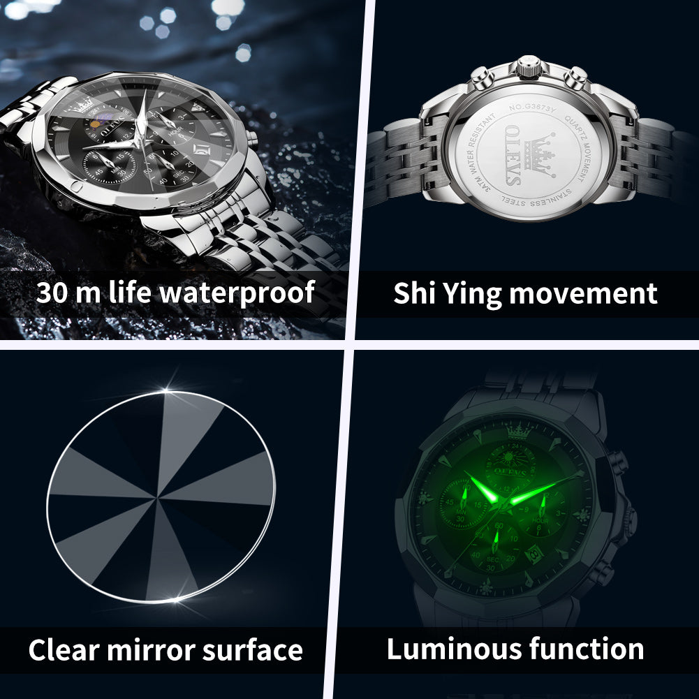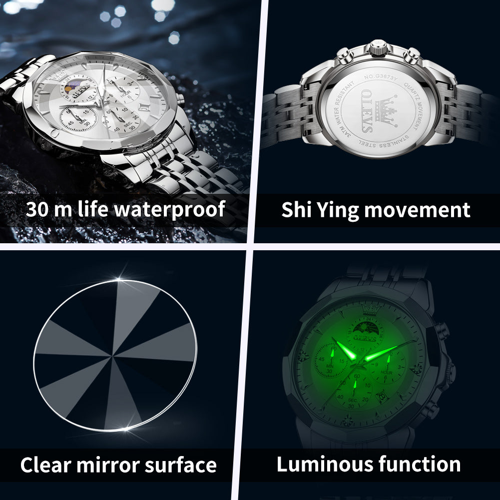 OLEVS 3673 Watches For Men Business Dress Luxury Casual Chronograph Multifunction Analog Quartz Stainless Steel Waterproof Luminous Moon Phase Date Men Wrist Watches Reloj Para Hombre