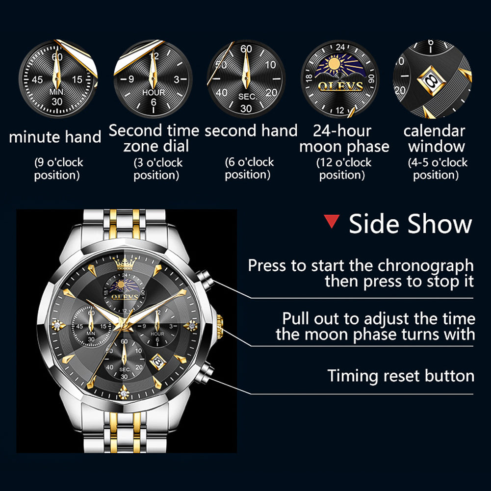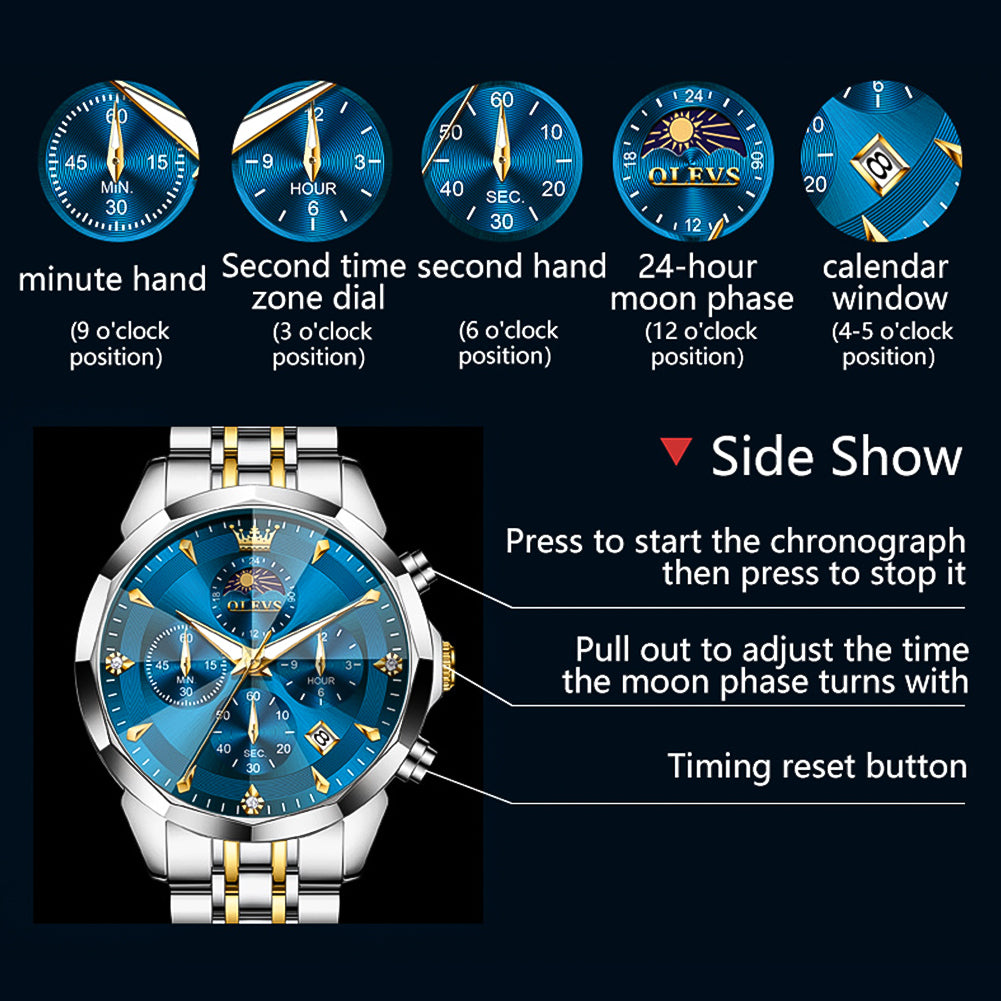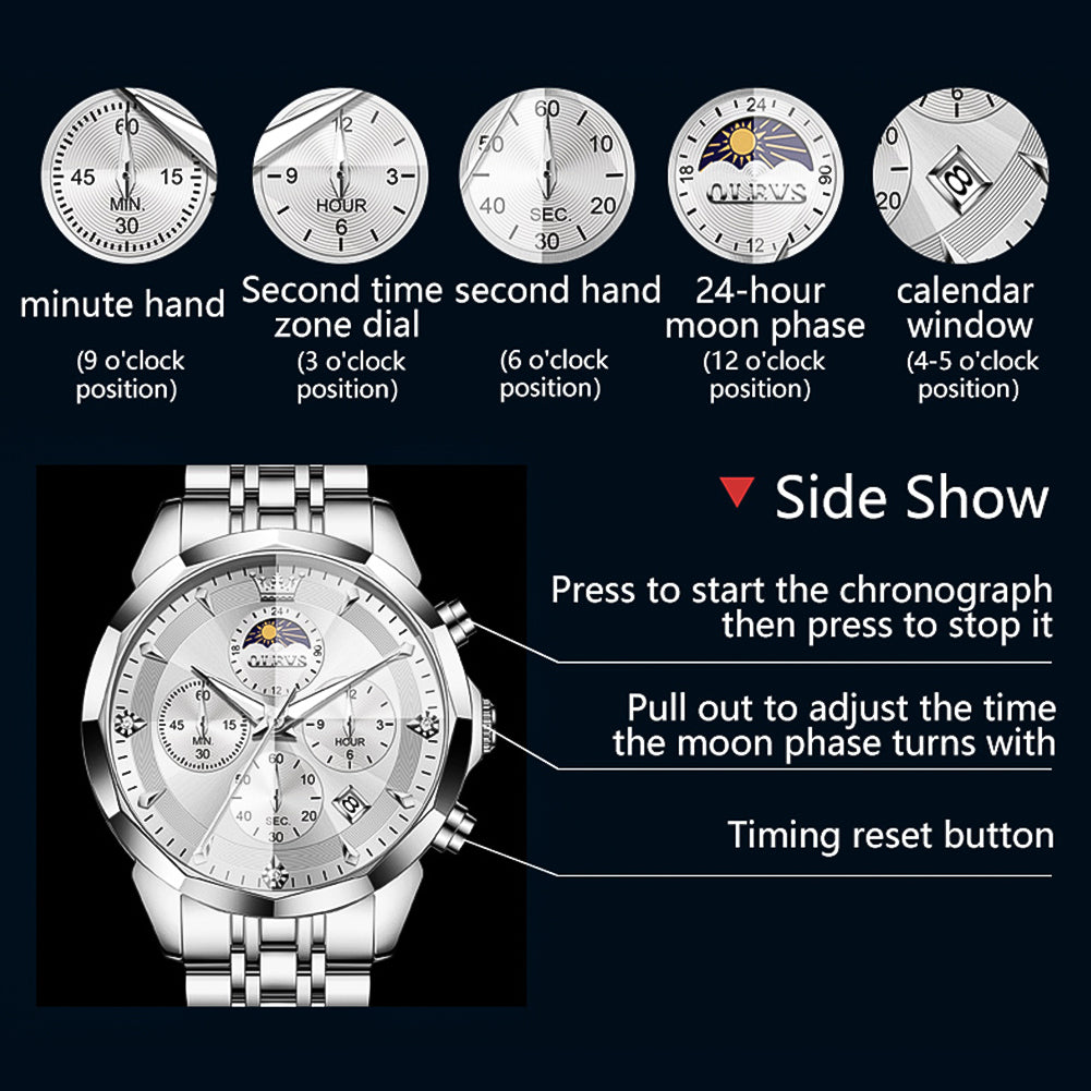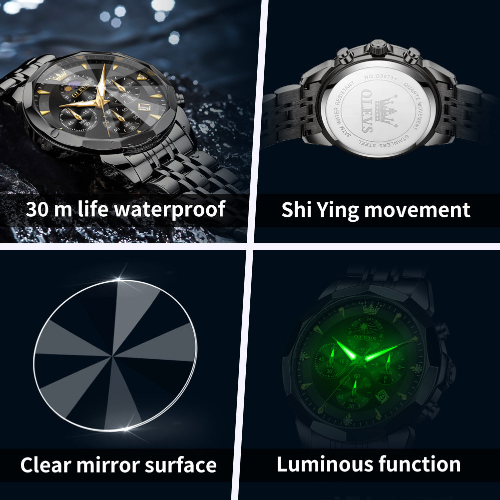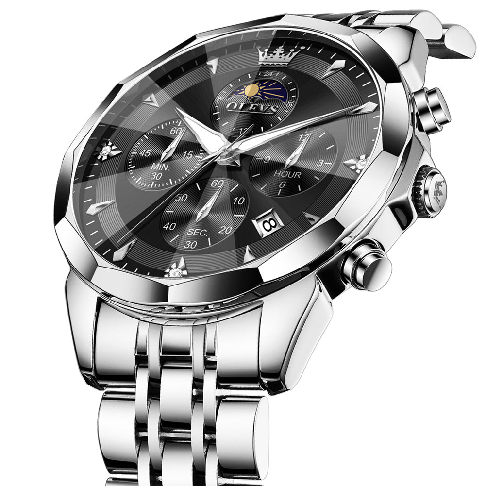 OLEVS 3673 Watches For Men Business Dress Luxury Casual Chronograph Multifunction Analog Quartz Stainless Steel Waterproof Luminous Moon Phase Date Men Wrist Watches Reloj Para Hombre