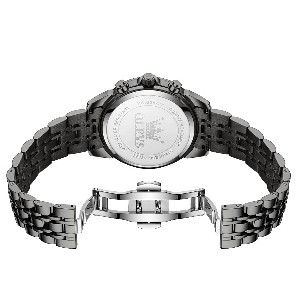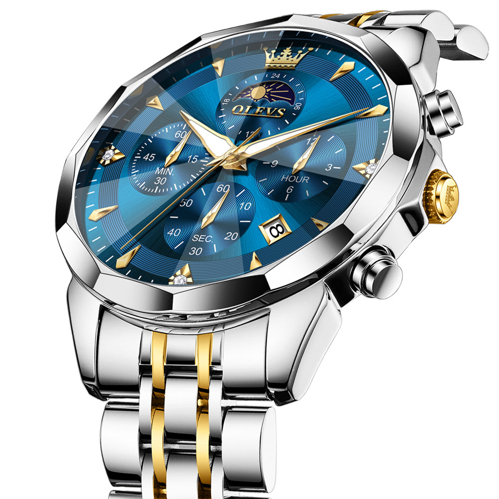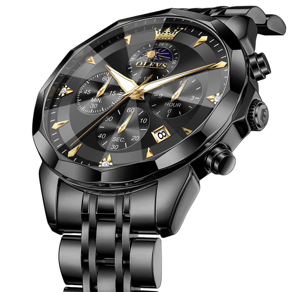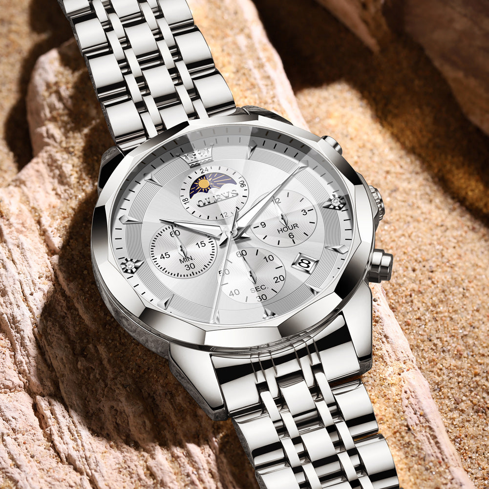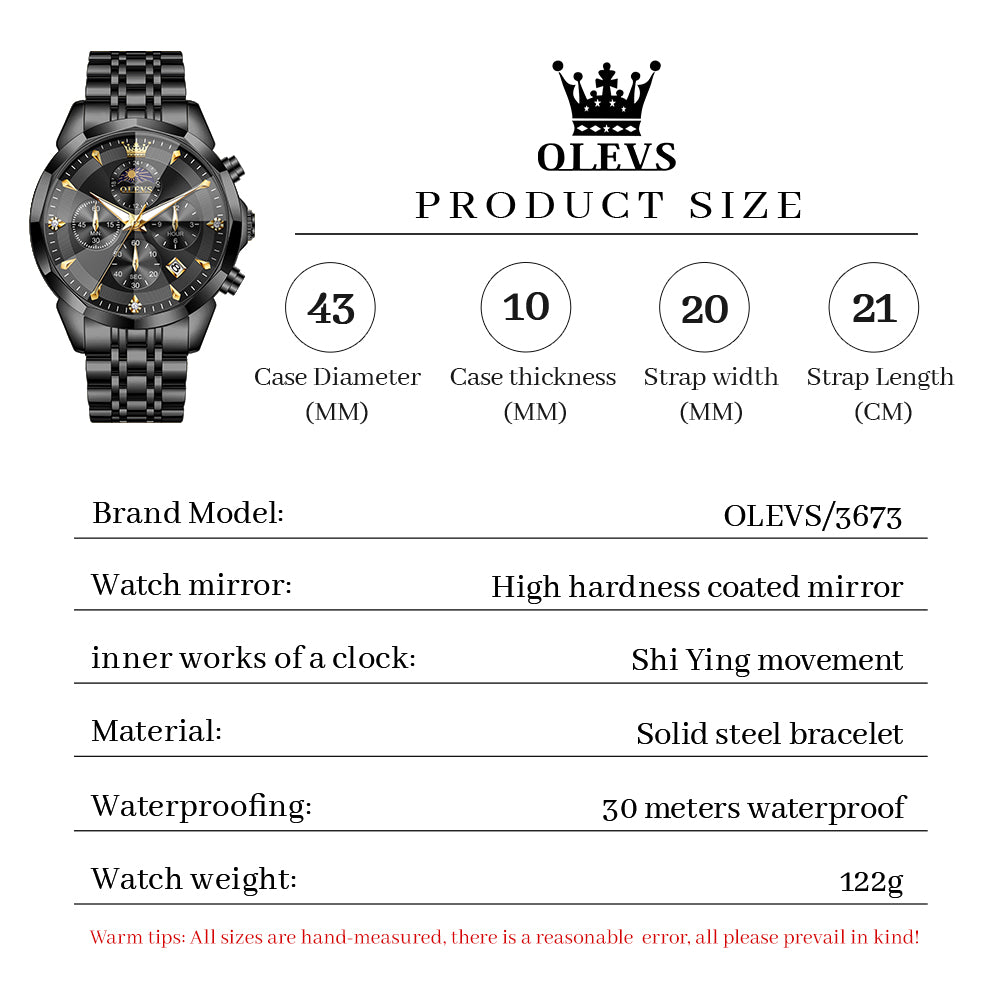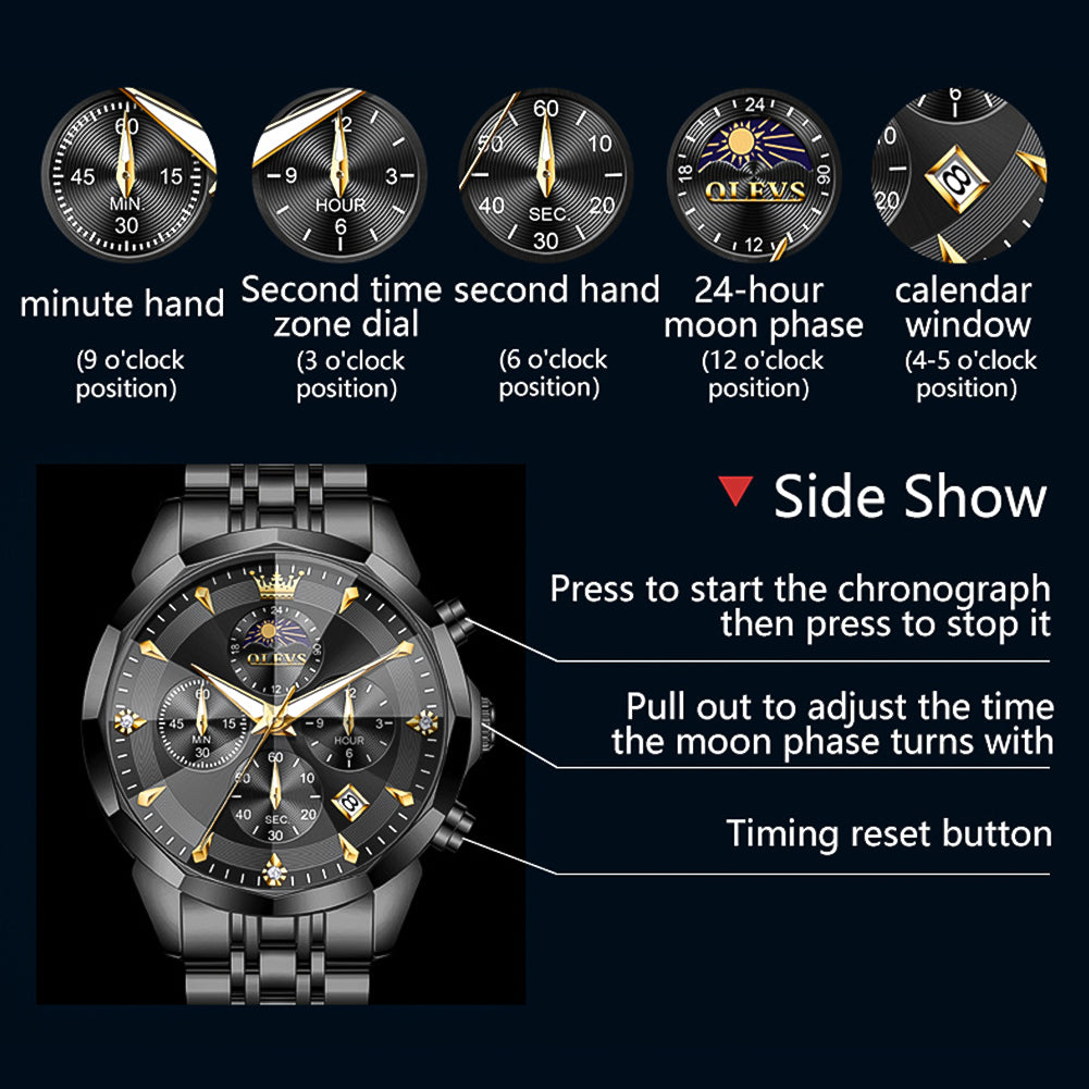 OLEVS 3673 Watches For Men Business Dress Luxury Casual Chronograph Multifunction Analog Quartz Stainless Steel Waterproof Luminous Moon Phase Date Men Wrist Watches Reloj Para Hombre