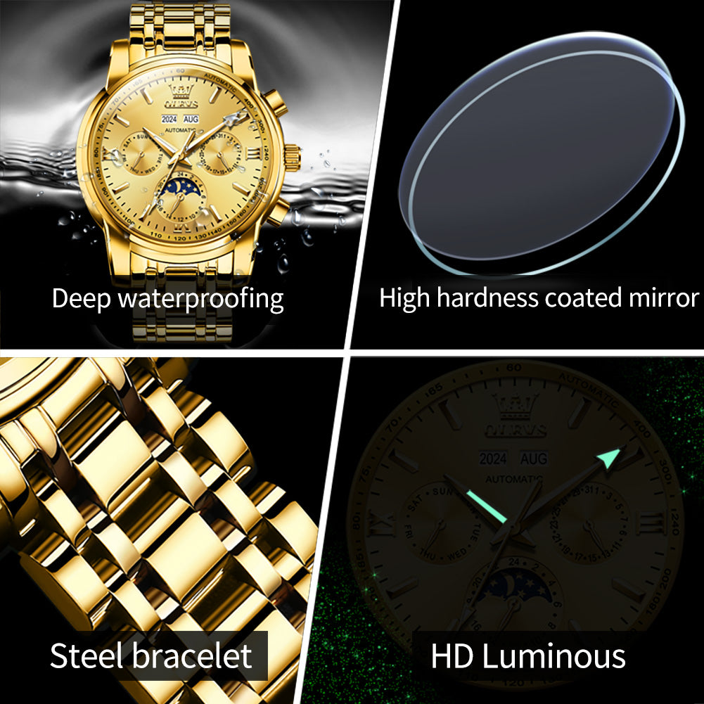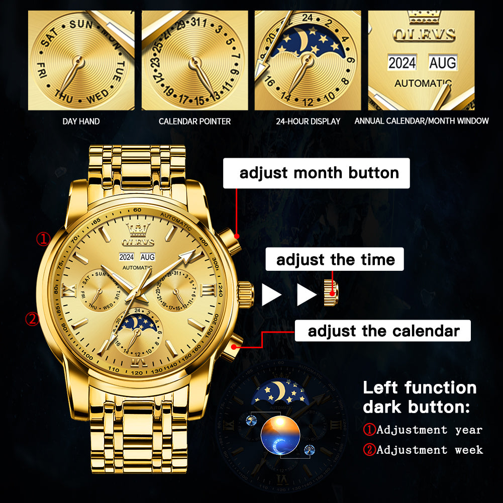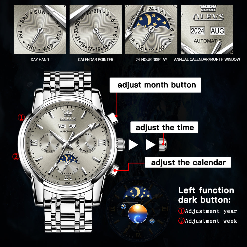 ๐Multifunctional Dial Mechanical Watches : High hardness coated mineral mirror. Multi-function six-pin Interpret the classic layout, elegant shape,beautiful and practical. Week/calendar/24-hour moon phase, annualcalendar month window matching.With luminous hands.