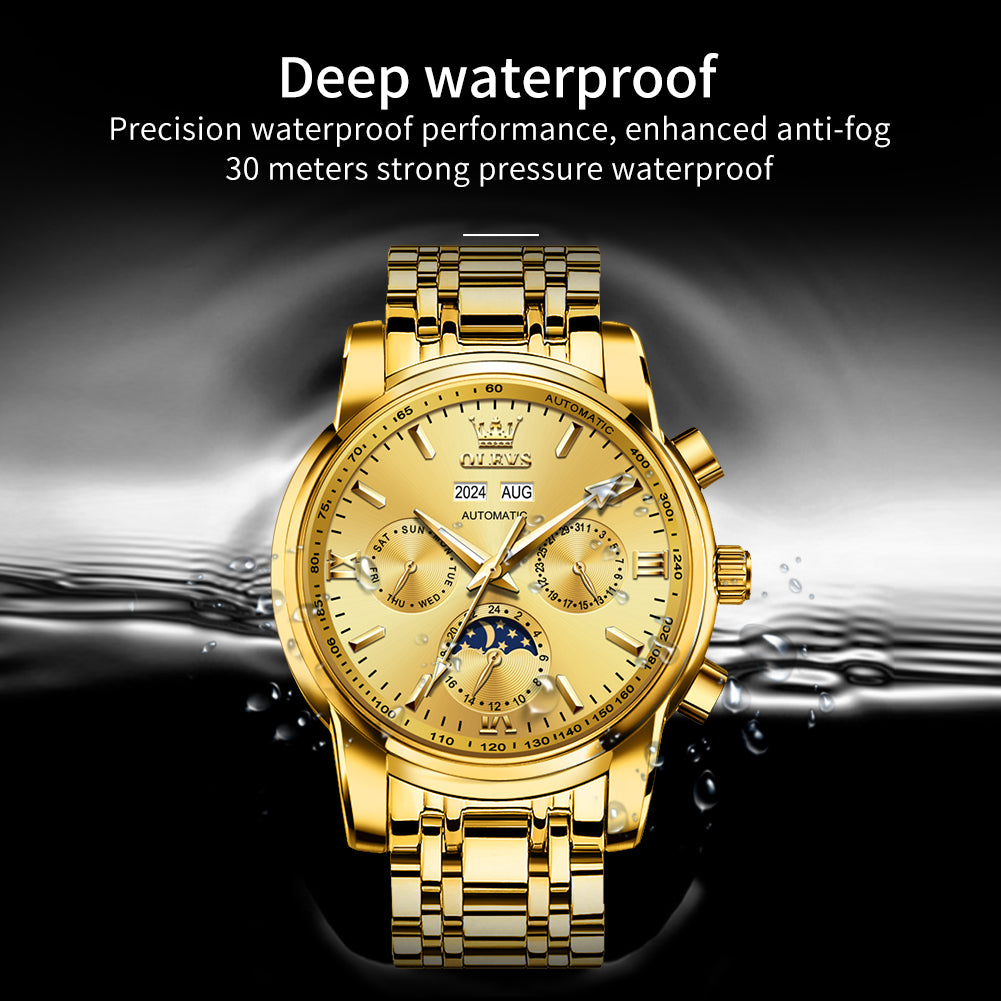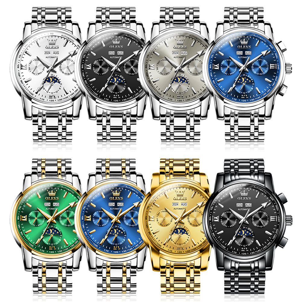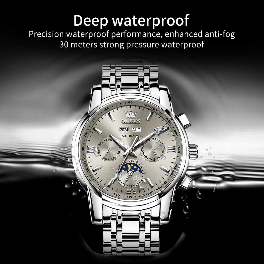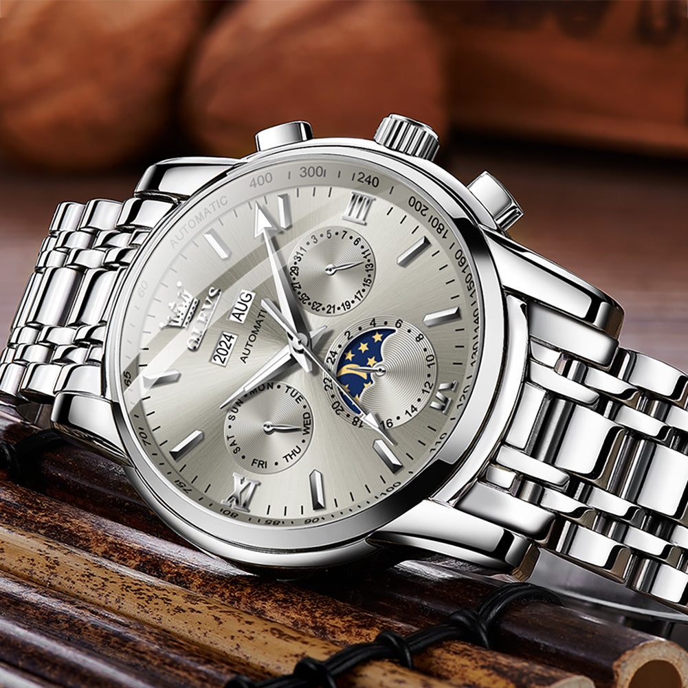 ๐Multifunctional Dial Mechanical Watches : High hardness coated mineral mirror. Multi-function six-pin Interpret the classic layout, elegant shape,beautiful and practical. Week/calendar/24-hour moon phase, annualcalendar month window matching.With luminous hands.