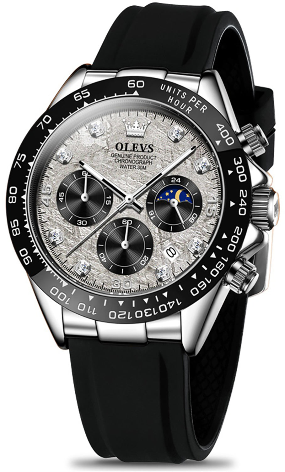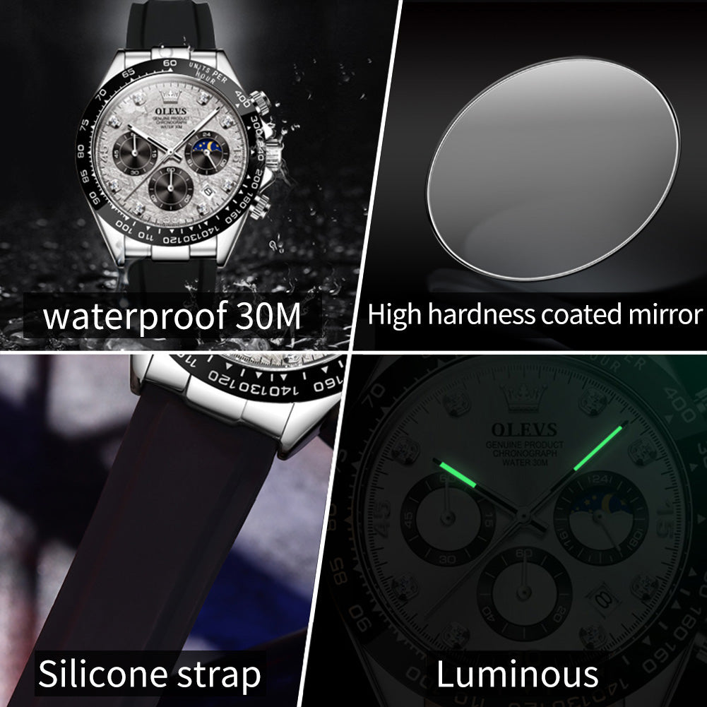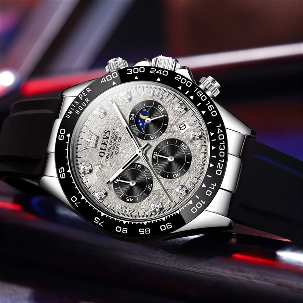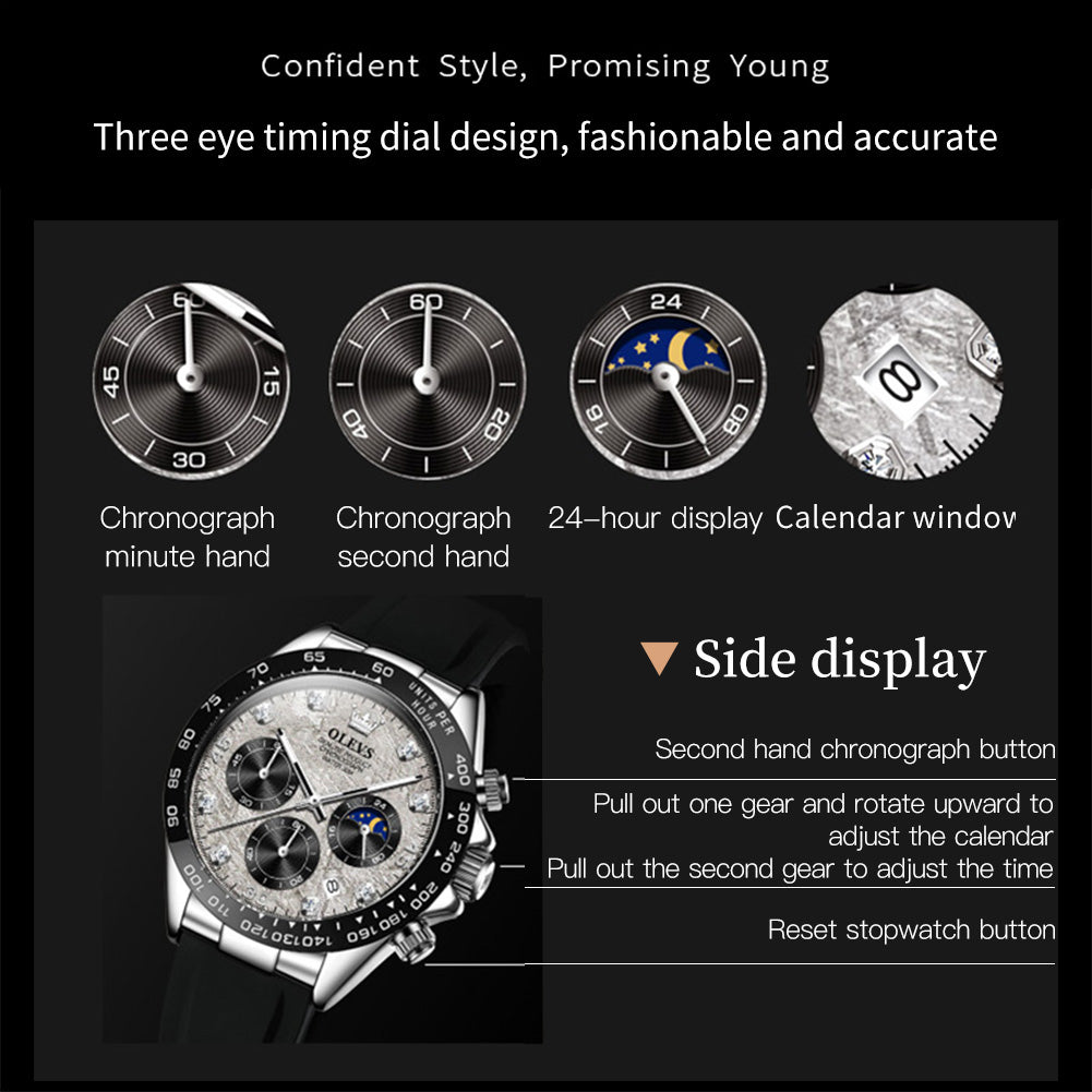 ⌚ High quality chronograph watches ⌚: 5 o'clock is calendar window, The sub dial in the 9 o'clock is minute chronograph, The sub dial in the 6 o'clock is second chronograph, The sub dial in the 3 o'clock is 24 hours and Moon phase dial. 3 sub-dials provide precise time keeping.